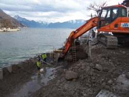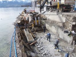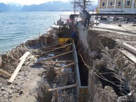 Eine weitere ereignisreiche Baustellenwoche liegt hinter uns. Die Arbeiten an der Schiffslände sind voll im Gange. Bei Trachten Reingruber konnte inzwischen sogar schon die Stützmauer betoniert werden, die künftig die Fahrbahn von der Arkade trennen wird. Ansonsten wird dort fleißig an den Leitungen gearbeitet.