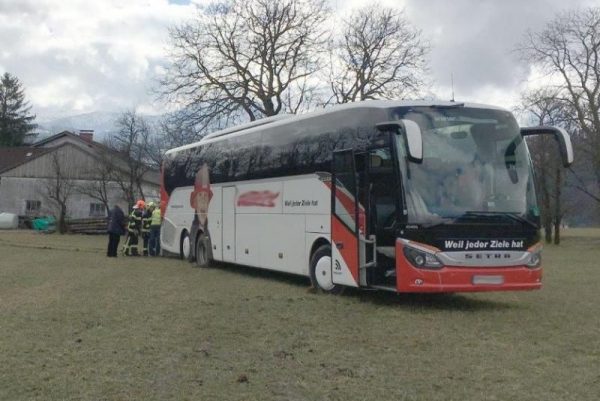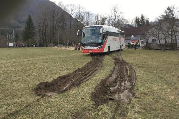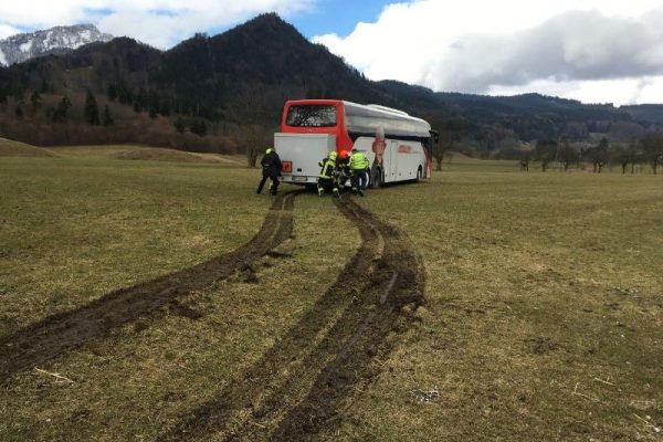 Da die Straße in diesem Bereich immer enger wird, entschied sich der Buslenker bei einem landwirtschaftlichen Anwesen umzudrehen. Er fuhr entlang einer Schotterstraße, um in einem angrenzenden Wiesenfeld umzudrehen. Aufgrund der nassen Wiesenverhältnisse kam der Reisebus schnell zum Stehen und konnte weder vor noch zurück.