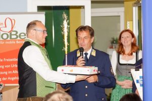 Als besondere Überraschung überreichten Josef Leichtfried (Präsident der OÖ Wasserrettung) und Gerald Berger (Landesleiter der OÖ Wasserrettung) dem Vereinsobmann Roman Haunschmid eine köstliche Geburtstagstorte und bedankten sich dafür, dass die MoBet Feriencamps jedes Jahr in ihrem Jugendzentrum in Nußdorf am Attersee stattfinden.