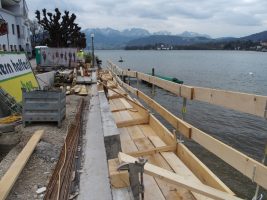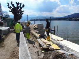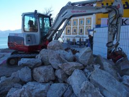 In dieser Woche konnte bei wunderbarem Frühlingswetter und fast sommerlichen Temperaturen gearbeitet werden. Gute Laune machte allerdings nicht nur der Sonnenschein, sondern auch der Baufortschritt: Die Arbeiten an der Schiffslände gehen in Riesenschritten voran. Die neuen Pflastersteine bewirken wie schon bei den anderen Abschnitten auch hier bereits jetzt ein modernes städtisches Flair und auch durch die Leistensteine, die mittlerweile an der Seeseite der Straße gesetzt wurden, nimmt die Neugestaltung buchstäblich schon Form an.