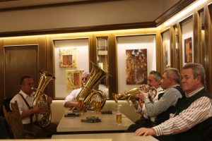 „In Regau bin i scho a weng dahoam jetzt“, resümierte Walter Egger, der schließlich nicht zum ersten Mal auf Einladung der FF Regau hier gastierte. Für „Derblecka“ sammelt er ein ganzes Jahr lang Material: „Da wird keine Zeitung weggeschmissen.“ 6 bis 7 Kilo Zeitungsausschnitte kommen alljährlich zusammen, denn „ich bin ein Perfektionist.“ Und so spannte sich der bissige Bogen von Donald Trump bis Pfarrer Hörtenhuber, von Noch-Landeshauptmann Josef Pühringer bis zu Altbürgermeister Fritz Feichtinger mit seinem legendären Spruch „Samma wieda guat!“ Schwungvoll umrahmt wurden die verbalen Seitenhiebe von einer Abordnung der Bürgerkorpskapelle Regau.