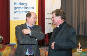 Vor einem gefüllten Saal stellten sowohl Scheuer als auch Lehner die gegenseitige Wertschätzung der beiden Kirchen in den Vordergrund. Einig waren sich beide auch in der Auffassung, dass die Kernaufgaben, wie z. B. von Gott reden und seine Geschichten zu erzählen oder auch zu gesellschaftspolitischen Themen aus christlicher Sicht Stellung zu nehmen, von beiden Kirchen weiterhin wahrgenommen werden müssen.