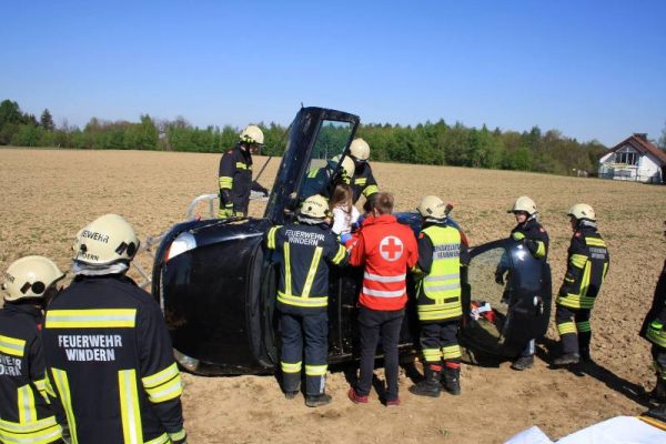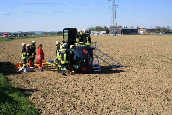Am Unfallort wurde ein auf der Seite liegendes Auto – nach einem Überschlag – vorgefunden. Ersthelfer sowie ein zufällig in der Nähe befindlicher Rot-Kreuz-Wagen waren ebenfalls vor Ort.