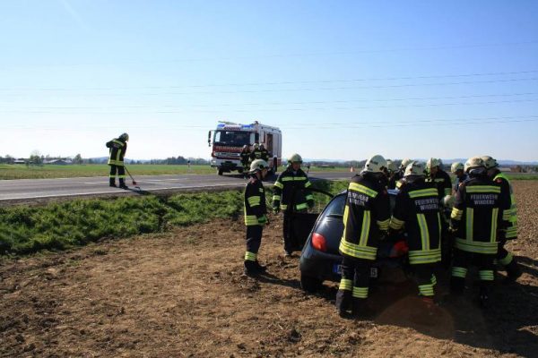 Die Feuerwehr Windern wurde Sonntagnachmittag gegen 16:00 Uhr zu einem Verkehrsunfall mit eingeklemmter Person, auf die B 135 in Viecht alarmiert. In kürzester Zeit rückte die Feuerwehr mit 25 Mann zum ca. 900 Meter entfernten Unfallort aus.