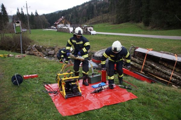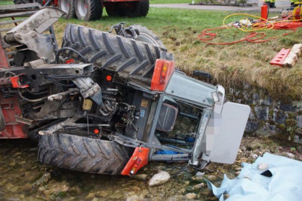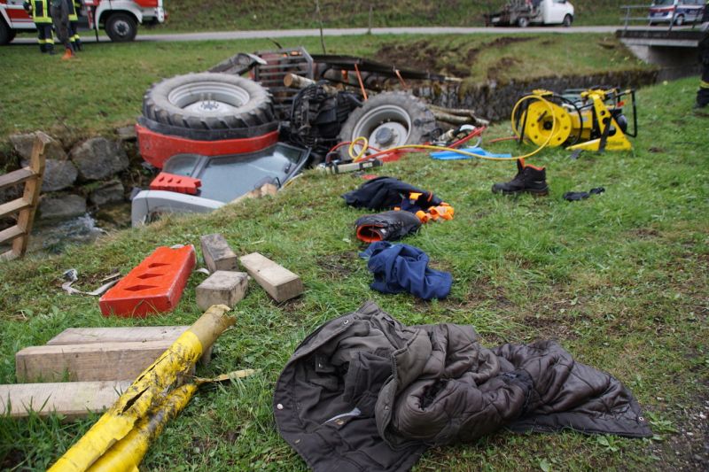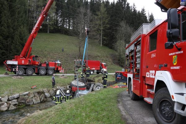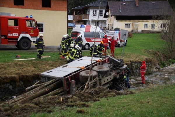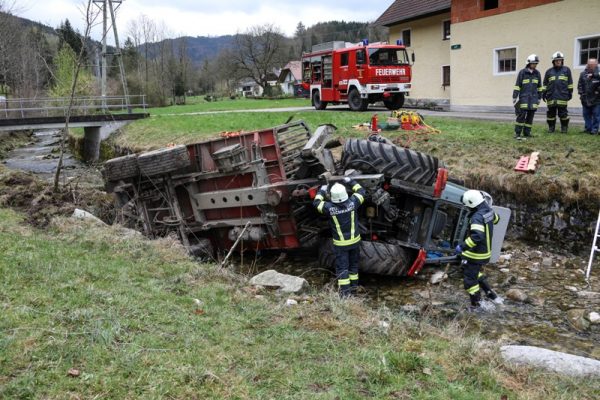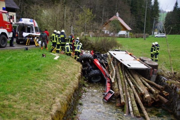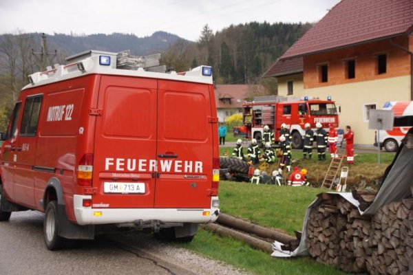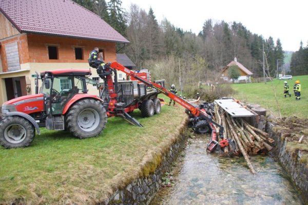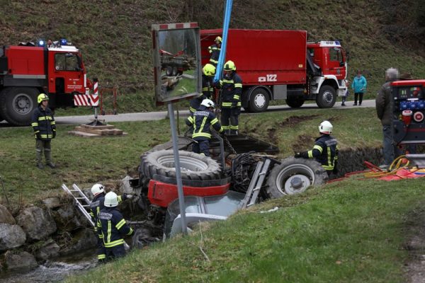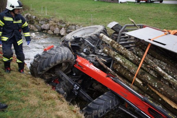 Aus bisher noch ungeklärter Ursache kam das Gefährt mit einem mit Holz beladenen Anhänger von der Straße ab und stürzte über eine ca 1,5 Meter hohe Maurer in das Bachbett des Laudachbaches. Der Lenker des Traktors wurde dabei im Führerhaus eingeklemmt und lag mit dem Körper im eiskalten Wasser. Die Feuerwehr konnte den Mann nach etwa einer halben Stunde bergen. Den Aufstieg über eine Leiter konnte der Mann selbständig bewältigen. Der Verunglückte wurde vom Notarzt erstversorgt, es konnten keine sichtbaren Verletzungen festgestellt werden.
