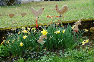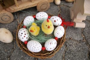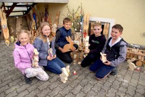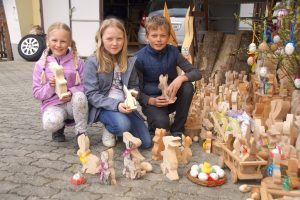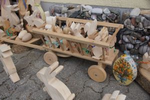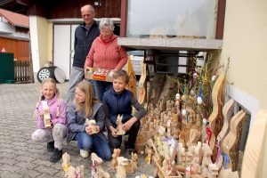Jedes Jahr werden so zu Ostern aus Holz unzählige Hasen, Henderl, Ostereier etc. ausgeschnitten und gedrechselt, durch Oma Elisabeth kunstvoll bemalt und mit Mascherl verziert und in Schachteln und Kisten verstaut. In der Karwoche wird dann vor dem Haus die ganze Hasenschar und alle gefertigten Holzfiguren und Osterbasteleien – dieses Jahr ca 250 dieser Geschenke – liebevoll aufgebaut. Alle Kinder, Nachbarn und Bekannte, die dann am Hause Egger vorbeigehen, dürfen sich ein Ostergeschenk aussuchen und mit nach Hause nehmen.