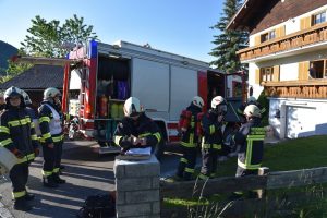 Der zweite Trupp begibt sich über Leitern und dem Carport in den ersten Stock, muss aber die Bergung auf diesem Weg abbrechen, da das Dach zu schwach ist. Man entscheidet sich den Weg durch das Stiegenhaus zu nehmen und die eingeschlossenen mittels Fluchthaube ins Freie zu geleiten. Übungsziel erreicht, nachdem alle Personen aus dem Gebäude in Sicherheit gebracht wurden.
