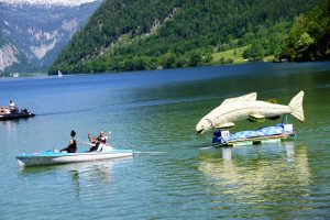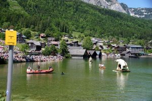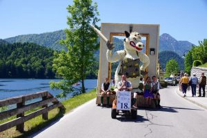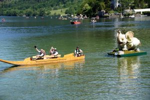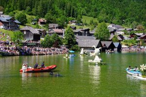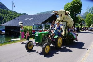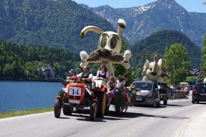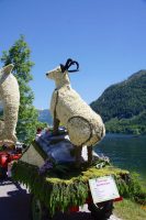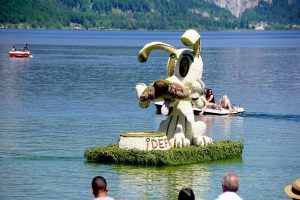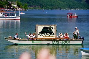 Gegen Mittag wurden dann die geschmückten Wagen mit Fahrzeugen zum Grundelsee gebracht und mit Hilfe eines Kranes zu Wasser gelassen. Entlang des Ufers waren zahlreiche Verkaufsstände mit Schmankerln, Kaffee, Kuchen und kühlen Getränken aufgestellt, um für das leibliche Wohl zu sorgen.