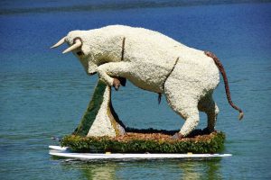 Der Traumtag mit stahlblauem Himmel und Sommertemperaturen fand dann mit dem Seekorso ab 14:30 Uhr seinen Höhepunkt. Ganz langsam wurden die Kunstwerke mit Booten an den tausenden Zuschauern vorbeigezogen. Der Dank mit tosendem Applaus für die hunderten Arbeitsstunden an den Narzissengebilden war nicht zu überhören.