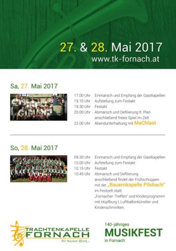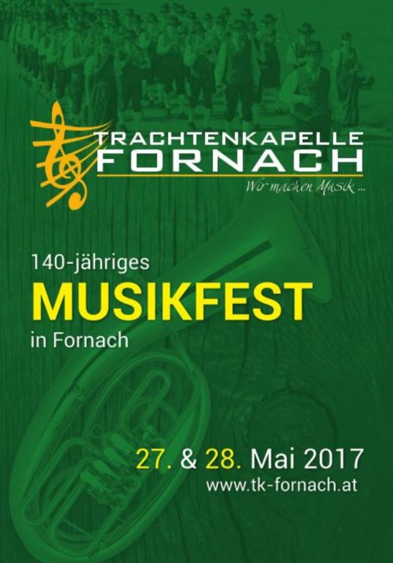Die Trachtenkapelle Fornach begeht heuer ihr 140-jähriges Bestandsjubiläum.  Dieser einmalige Anlass wird dazu verwendet, um mit allen Freunden und Gönnern der Musikkapelle, am 27. und 28. Mai 2017 ein gemeinsames Musikfest zu feiern.