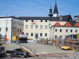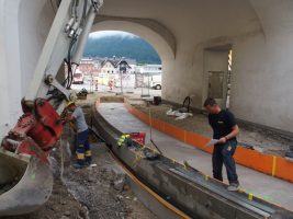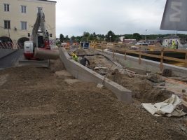 Inzwischen fand im nördlichen Bogen des Trauntors in Windeseile die Gleisverlegung statt. Auch das Schweißen und das Betonieren der Gleistragplatte sind bereits erfolgt. An der Brücke wurde mit dem Ausschalen begonnen und am Museumsplatz die neue Stützmauer errichtet.