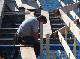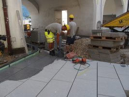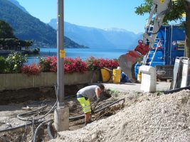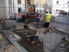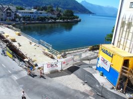 Arbeiten, wo andere Urlaub machen: Im Schatten des Trauntors wurden diese Woche Pflastersteine verlegt, bei sengender Hitze am Museumsplatz an der Rampe weiter gearbeitet und über dem kühlen Blau des Traunsees auf der Brücke die Schalung für den Randbalken vorbereitet und der Beton abgedichtet.