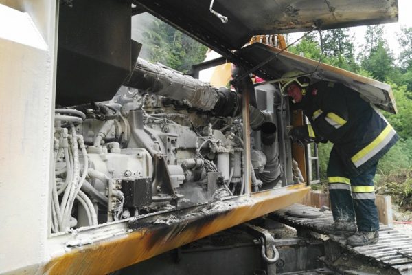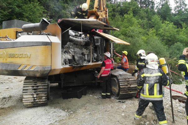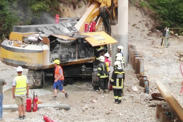 Zum Brand einer Baumaschine kam es heute in den Nachmittagsstunden im Kraftwerksbereich eines Laakirchner Industriebetriebes. Da sich das in Brand geratene Gerät am gegenüberliegenden Traunufer befand und ein Befahren der Baubehelfswege für Feuerwehrfahrzeuge unmöglich war, musste die Brandbekämpfung mit einem Handfeuerlöscher durchgeführt werden.
