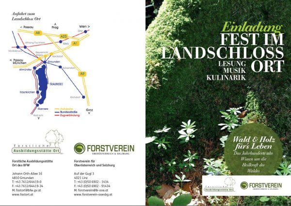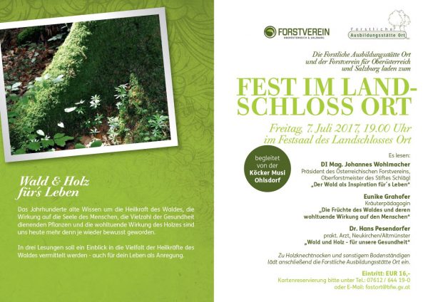 Die Forstliche Ausbildungsstätte Ort und der Forstverein für Oberösterreich und Salzburg veranstalten am 7. Juli 2017, Beginn 19.00 Uhr, im Festsaal des Landschlosses Ort das FEST IM LANDSCHLOSS 2017. Thema der Veranstaltung ist „Wald & Holz für´s Leben“.
