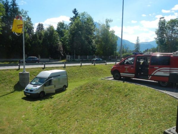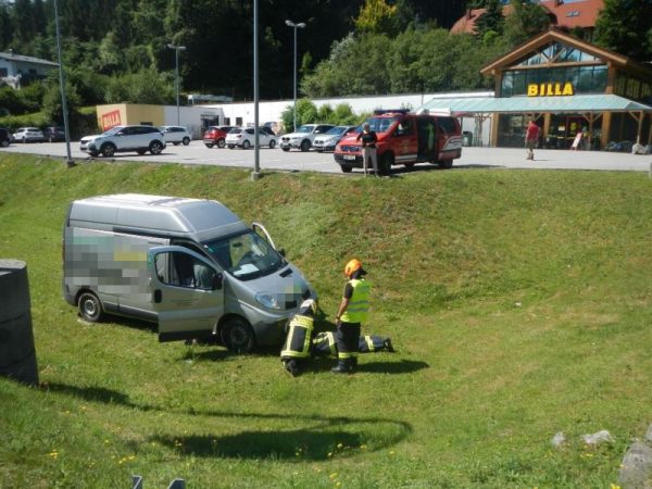 Während sich der Lenker am Montagvormittag in einem Altmünsterer Supermarkt eine Jause kaufte, begann sein Firmenfahrzeug aus bisher ungeklärter Ursache zu rollen und kam schlussendlich in einem Regenauffangbecken zum Stehen.