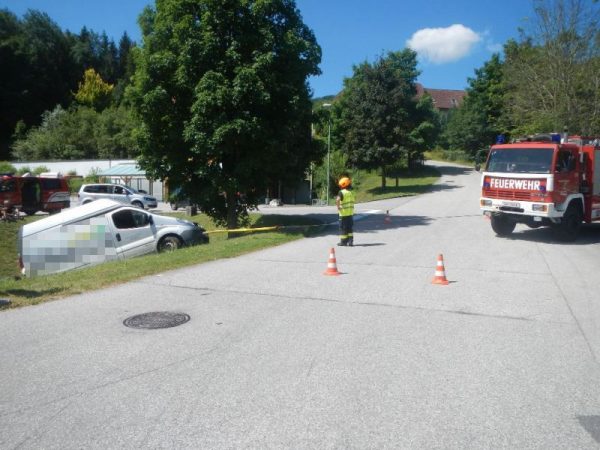 Mit einer Seilwinde zogen die Männer der Feuerwehr Altmünster den unbeschädigt gebliebenen Klein-LKW wieder auf die Fahrbahn zurück. Während der Fahrzeugbergung musste die Zufahrt zu den Einkaufsmärkten an den B 145 kurzzeitig gesperrt werden.