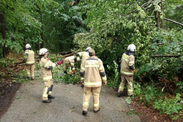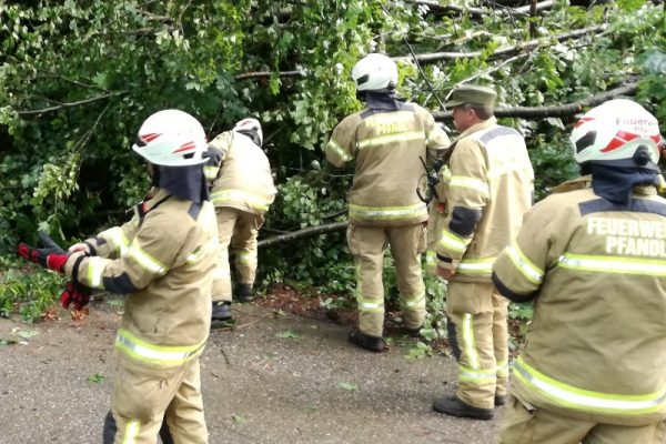 Kurze Zeit darauf rückten die Kameraden der FF-Pfandl mit dem LFA zum Einsatzort aus. Mehrere Bäume stürzten während einem Unwetter über die Straße und blockierten diese. Mit mehreren Motorsägen wurden die Bäume zerkleinert und von der Straße entfernt. Der Einsatz konnte anschließend beendet werden.