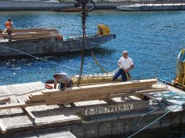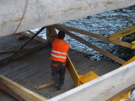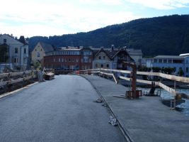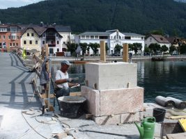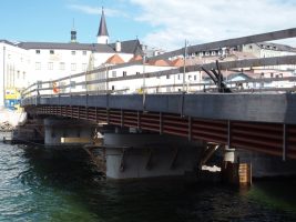 Mittlerweile konnte an der Unterseite des Brückentragwerks die Montage sämtlicher Verrohrungen abgeschlossen werden und auch die Pontons sind wieder verschwunden. Stadtseitig wurde ein neuer Sockel für die Nepomuk-Statue errichtet. Allerdings wird der steinerne Heilige erst nächstes Jahr seinen Platz darauf einnehmen, wenn sicher gestellt ist, dass ihm keine größeren Arbeitsgeräte mehr zu Leibe rücken könnten ;)