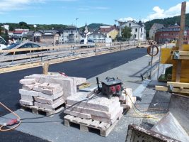 Nach den Asphaltierungsarbeiten in KW 28 sollte an dieser Stelle vielleicht nochmal erklärt werden, dass es sich hierbei nur um einen provisorischen Fahrbahnbelag handelt: Da auf diesem Teil der Brücke nach der Fertigstellung viel Platz für jeweils einen Geh- und einen Radweg vorgesehen ist, wird die zukünftige Fahrbahn mitsamt der Gleisanlage ein Stück weiter vom Rand abrücken als es derzeit den Anschein hat. Die finale Errichtung der Fahrbahn und Gleise kann also erst nach dem Bau der zweiten Brückenhälfte erfolgen.