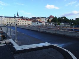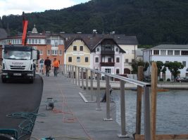 Bis auf die eine oder andere Anlieferung per LKW sind für eine Weile die größeren Maschinen und Baugeräte verschwunden und so wirkt es bisweilen ungewöhnlich ruhig auf unserer Baustelle. Gearbeitet wird dennoch: In der vergangenen Woche konnte mit der Errichtung des Brückengeländers begonnen werden. Nachdem der Rahmen des Geländers bereits montiert wurde, wird daran nun in mühevoller Handarbeit das Netz befestigt, bevor die Montage des eigens für uns angefertigen Handlaufs erfolgen kann. Währenddessen wird auch noch an den Oberflächen der westlichen Stützmauern gearbeitet.