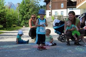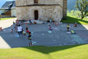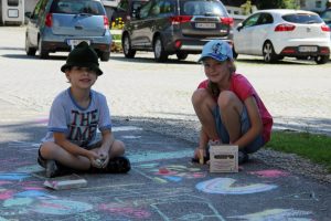 Gosauer Volksschüler und befreundete Kinder haben am 6. Juli die Kirchenstraße in Gosau für zwei Stunden in Beschlag genommen und das Grau der Straße mit Straßenmalkreiden in einen bunten Bilderteppich verwandelt.