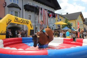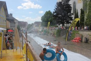 Der Tourismusverband Attergau und die Gemeinde St. Georgen organisierten erstmals einen Splashmob am Nikolaus Harnoncourt Platz. Viele Familien und Kinder folgten der Einladung trotzt mittelmäßigem Wetter. Um kurz vor 15:00 Uhr warteten viele schon gespannt auf das Startkommando „Wasser marsch!“ durch den Moderator Pippo. Kinder jedes Alters, aber auch der ein oder andere Erwachsene, ließen sich nicht vom eiskalten Wasser abschrecken und Rutschten gleich mehrmals den Kirchenhügel hinab. Egal ob auf Knien, im Sitzen oder auch mit einem Luftreifen stand das Rutschvergnügen im Mittelpunkt. Aber auch das Rahmenprogramm wie Bullriding war sehr beliebt, auch wenn der Abwurf vom Bullen meisten nicht lange auf sich warten ließ. Seine Muskelkraft in den Armen konnte man beim „Abhängen mit Life Radio“ auf eine Reckstange testen. Gesungen wurde an der Karaoke-Station direkt vor der Sommerbar des Kirchenwirts und für ein Andenken der besonderen Art sorgte die Fotobox. Abschließend warteten zahlreiche Gewinnspiele auf die Gäste. Umrahmt wurde die Veranstaltung durch eine Musikbühne von Life Radio. Für viele Kinder war der Splashmob inklusive der Wasserrutsche neben dem Beginn der Sommerferien die Kirsche auf dem Sahnetörtchen. Besonderen Dank gilt der FF St. Georgen als auch dem Bauhof Team St. Georgen welche diese Veranstaltung erst ermöglichten.
