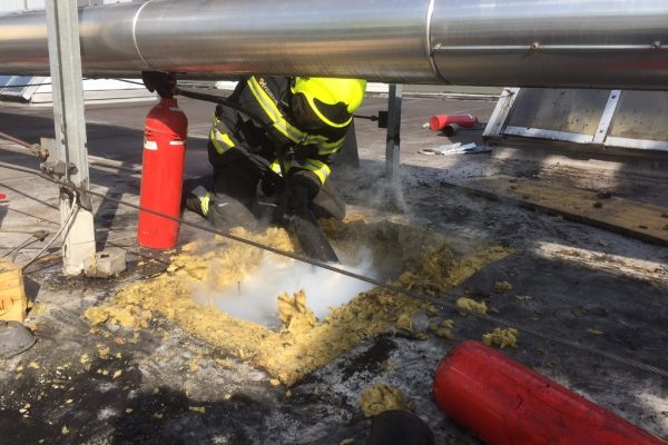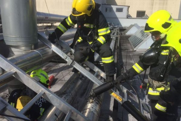 Mitarbeiter versuchten vorerst selbst den Brand einzudämmen. Die Einsatzkräfte der Feuerwehr Puchheim begannen mit Atemschutz und CO2 Löschern mit der weiteren Brandbekämpfung. Von den Mitarbeitern der Firma wurden sämtliche CO2 Löscher vom Werksgelände zusammengetragen. Zur Unterstützung der Brandbekämpfung wurde die Feuerwehr Attnang und die Feuerwehr Vöcklabruck mit dem Hubrettungsgerät und einem Tanklöschfahrzeug nachalarmiert.