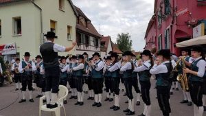 Über Einladung der Stadt Marlenheim im Elsaß organisierte Ehrenkapellmeister Max Staflinger vom 13.-16.08.2017 bereits die 5. Konzertfahrt in diese Weinstadt. Unter Obmann DI Hubert Brandmayr und Kpm. DI Bernhard Hutterer umrahmten die Oberösterreicher bei der historischen Fürstenhochzeit „Le Mariage de l`Ami Fritz“ mit österreichischer Blasmusik Diplomaten-Empfänge, Hochzeitszug und Marienprozession sowie den Festgottesdienst. Bei der nachmittägigen Brautmesse brillierte der Oboist Stefan Zeininger mit seinem Solo. Höhepunkt war am Vortag der Hochzeit das nächtliche Jubiläumskonzert auf dem Hauptplatz mit dem Solo der Schlagzeuggruppe.