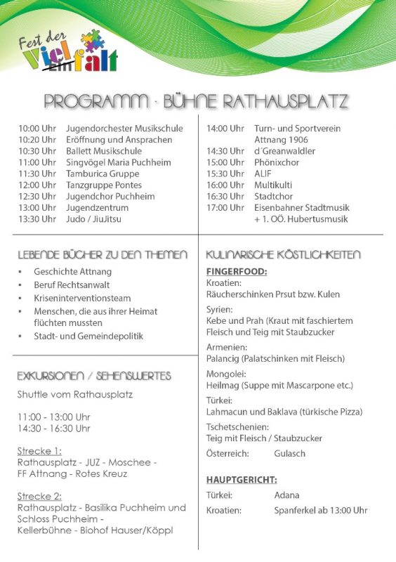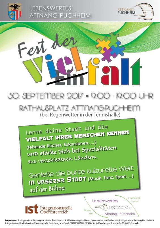 Unzählige Attnang-Puchheimer Bürger und Vereinsmitglieder haben etwas ganz Tolles auf die Beine gestellt. Am Samstag, 30. September findet ganztägig am Rathausplatz das große Fest der Vielfalt statt. Auf der Bühne gibt’s rund um die Uhr Rahmenprogramm aus den Bereich Musik, Sport und Tanz – alles dargeboten von den heimischen Vereinen.
