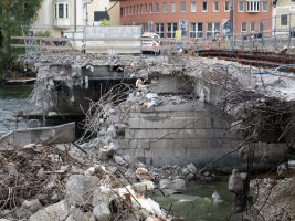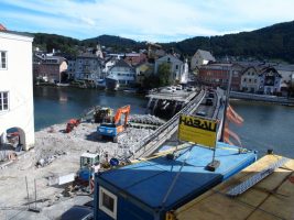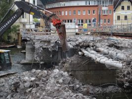 Bagger, Bagger, Bagger… gab es auch in KW37 in Hülle und Fülle auf unserer Baustelle zu beobachten. Inzwischen wurden ein großer Teil des Tragwerks der Altbrücke und auch der westliche Brückenpfeiler abgetragen.