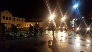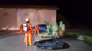 Die alarmierten Freiwilligen Feuerwehren mussten sich daher zuerst einen Überblick über die gefährliche Situation schaffen, bevor mit schwerem Schutzanzug der Stufe 3 die Rettung der verletzten Person vorgenommen werden konnte. Bei dieser Übung wurde speziell auf das richtige Anlegen der Schutzausrüstung, sowie Einhalten der Sicherheitsrichtlinien geachtet. Ordnungsgemäß wurde die eingesetzte Mannschaft am Deko-Platz gereinigt.