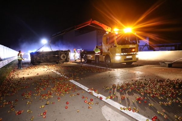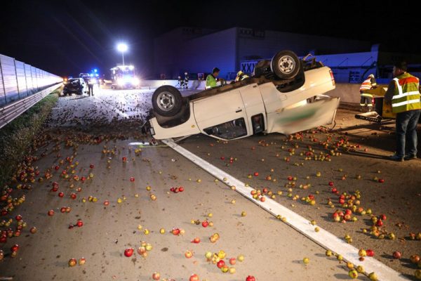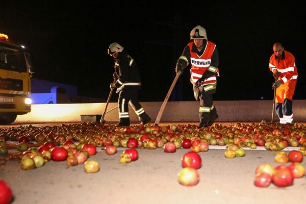 Tausende Äpfel lagen nach dem Crash auf der Autobahn. Die Feuerwehr musste zur nächtlichen Apfelernte auf die Westautobahn ausrücken. Der Lenker des Kleintransporteres, ein 71-Jähriger aus Neumarkt am Wallersee, wurde nach der Erstversorgung durch Rettungsdienst und Notarzt mit leichten Verletzungen ins Klinikum Wels eingeliefert. Die Feuerwehr führte gemeinsam mit dem Streckendienst der ASFINAG die Fahrbahnreinigung durch. Die Westautobahn war zwischen Allhaming und Sattledt, in Fahrtrichtung Salzburg rund 15 Minuten gesperrt und insgesamt rund eine Stunde erschwert passierbar.