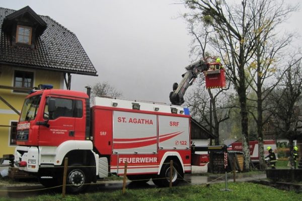 Die für Sonntag 29.10.2017 vorangekündigten Orkanböen im Salzkammergut sorgten auch bei der Feuerwehr St. Agatha für zahlreiche Einsätze. Vom frühen Morgen bis zum späteren Nachmittag gingen über 20 Meldungen, teilweise über die Landeswarnzentrale oder direkt per Telefon, bei der FF St. Agatha ein. Alle Einsatzfahrzeuge waren zeitgleich an verschiedenen Orten beschäftigt um die Schadensfälle nacheinander abzuarbeiten.