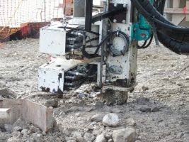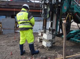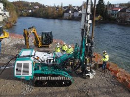 Noch immer wird das Geschehen auf unserem Baufeld durch den Grundbruch bei Pfeiler West bestimmt: Im Vordergrund stand die Anlieferung und Einrichtung der umfangreichen DSV(Düsenstrahlverfahren)-Ausrüstung, die momentan das ganze Bild auf der Baustelle dominiert. Das Bohrgerät selbst ist im Vergleich zu anderen schweren Geschützen, die hier schon aufgefahren sind, eigentlich relativ zierlich, das benötigte Zubehör rund um diese komplexe Maßnahme nimmt allerdings viel Platz ein. Dazu gehören unter anderem Zementsilo, Misch- und Pumpgeräte, die auf dem noch verbliebenen östlichen Teil der alten Brücke platziert wurden. Von dort aus wird die Suspension für die Bodenvermörtelung zum Bohrgerät bei Pfeiler West gepumpt und damit schließlich in den Untergrund eingebracht um diesen zu verfestigen. Die dabei entstehende Restflüssigkeit muss wiederum abgepumpt werden, wofür die Entsorgungscontainer am Westufer bereitgestellt wurden. Nach dem aufwendigen Einrichten und Einstellen der Ausrüstung konnte gegen Ende der Woche schließlich mit der Durchführung begonnen werden. Nun heißt es Daumen drücken, dass alles wie gewünscht funktioniert und nach der erforderlichen Aushärtungszeit der Errichtung von Pfeiler West nichts mehr im Wege steht.