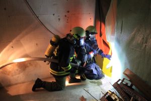 Im Keller wurde in einem Raum ein Brand simuliert, nach dem der AS Trupp den Brandraum betreten hat,  wurde mittels Überdruckbelüftung der Raum rauchfrei gemacht. Somit konnte anschließend der Brandherd abgelöscht werden. Da an diesem Ausbildungstag sehr viele Junge Kameraden als AS Träger dabei waren, konnten sie somit praktische Erfahrung unter realitätsnahen Bedingungen sammeln.