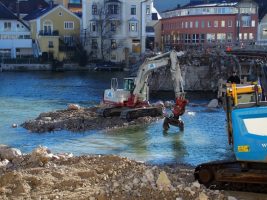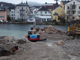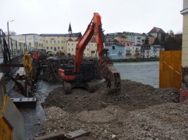 Die große Überschrift von Kalenderwoche 49 lautet „Kolksicherung“. Für Laien: Dies ist die Errichtung eines Steinwalles rund um einen Brückenpfeiler, wodurch verhindert wird, dass es in unmittelbarer Nähe eines Pfeilers durch die laufenden Strömungen zu Ausspülungen des Bodenmaterials kommt. Das Einbringen der Steine vom Seegrund bis knapp an die Wasseroberfläche erfordert viel Fingerspitzengefühl der Baggerfahrer, die Stein für Stein einzeln anordnen müssen.