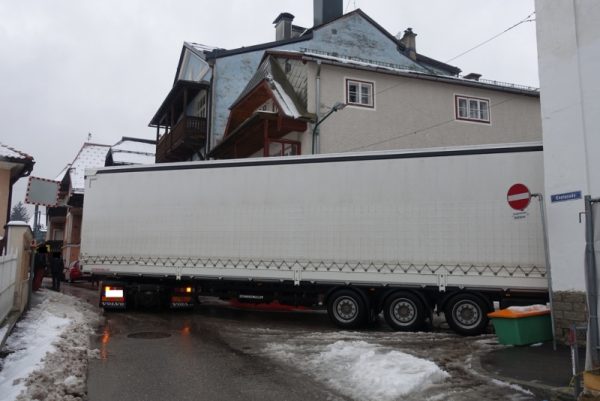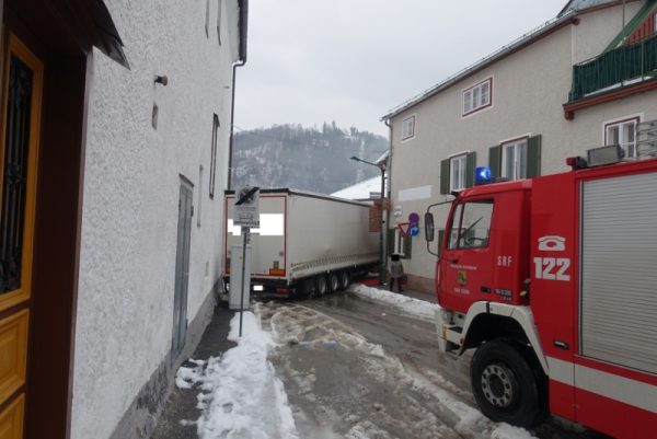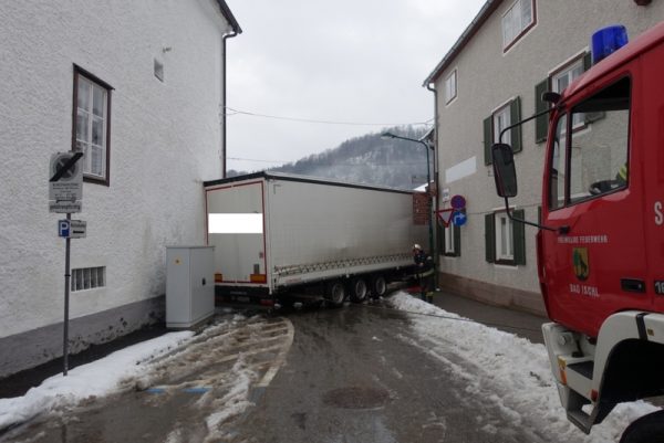 Heute Vormittag wurde die FF Bad Ischl informiert, dass ein Sattelzug zwischen zwei Häusern in der Ischler Kurhausstraße stecken geblieben ist. Der Lenker wollte mit seinem Sattelzug von der Kurhausstraße auf die Esplanade auffahren. Jedoch konnte er die Engstelle nicht passieren und verkeilte sich zwischen zwei Häusern. Für den Lenker gab es kein nach Vor und kein Zurück mehr.