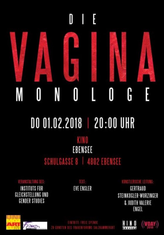 Immer im Februar gibt Eve Ensler die Rechte an ihrem preisgekrönten Bühnenstück „Die Vagina Monologe“ frei, damit diese im Rahmen von Benefizveranstaltungen weltweit gelesen werden können. In Österreich wird es insgesamt vier Lesungen geben: zwei in Wien, eine in Salzburg eine im Salzkammergut, in Ebensee.