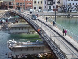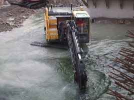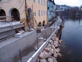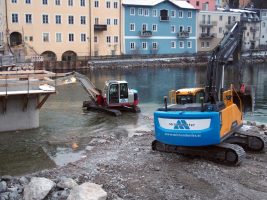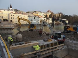 Auch Pfeiler Ost ist inzwischen längst fertig betoniert, die Spundwände konnten erfolgreich gezogen werden und es wurde in dieser Woche auch an den Lagersockeln der Brückenpfeiler gearbeitet. Ansonsten wurde vor allem gebaggert, gebaggert und gebaggert. Viele, viele Tonnen Steine für den Kolkschutz der Pfeiler wurden da bewegt und auch der Rückbau der Schüttung ist voll im Gange.
