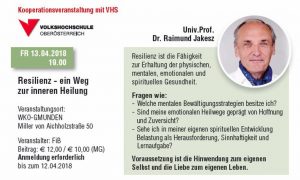 Das Highlight im Frühjahr ist der Vortrag von Univ. Prof. Dr. Raimund Jakesz. Er referiert über „Resilienz – ein Weg zur inneren Heilung“ (Veranstaltungsort: WKO Gmunden).