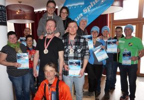 Gesamtfoto von der Staffelsiegerehrung vom „1. Dachstein Salzkammergut Hallstättersee Ice Swimming Foto: Peter Perstl