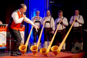 Mit dem Stück „Oregon“ von Jacob de Haan begann der zweite Teil des Konzertes. Mit „Ein Almentag“ fühlte man sich dann in die Schweizer Alpen versetzt. Die Musikgruppe „Vöcklataler Langholz“ mit ihren drei Alphörnern verführten die Zuschauer in die Berge und brachten einen ganz besonderen Flair in das Stadttheater Gmunden. Dass Blasmusik Freude macht zeigte das folgende Stück von Kurt Gäble und mit Uncle Ernie ging es nochmals nach „New York, New York“. Der offizielle Teil des Konzertes endete mit dem CASTALDO MARSCH von R. NOVACEK. Dem Wunsch der Zuschauer nach Zugabe entsprechend gab es natürlich noch zwei Zugaben, wobei noch einmal die drei Alphörner in Spiel kamen und als obligatorischer Abschluss der Radezkymarsch den Konzertabend unter tosendem Applaus der Fangemeinde endete.