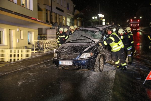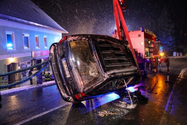 Der Unfall ereignete sich auf der Wolfsegger- beziehungsweise der Hauptstraße bei der Kreuzung mit der Pilsbacher- beziehungsweise Attnanger Straße im Ortszentrum von Ottnang am Hausruck. Aus bisher unbekannter Ursache überschlug sich ein Auto und kam am Dach im Bereich einer Mauer und einer Stiege zum Stillstand.