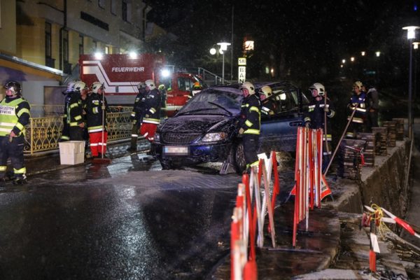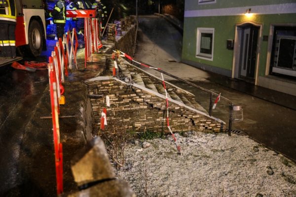 Mit einem Kran wurde das Auto wieder auf die Räder gestellt. Ausgelaufene Betriebsmittel mussten gebunden werden. Die Mauer samt Stiegenabgang wurde provisorisch abgesichert. Die Wolfsegger Straße war rund eine Stunde für den Verkehr gesperrt. Die Feuerwehr richtete eine örtliche Umleitung ein.