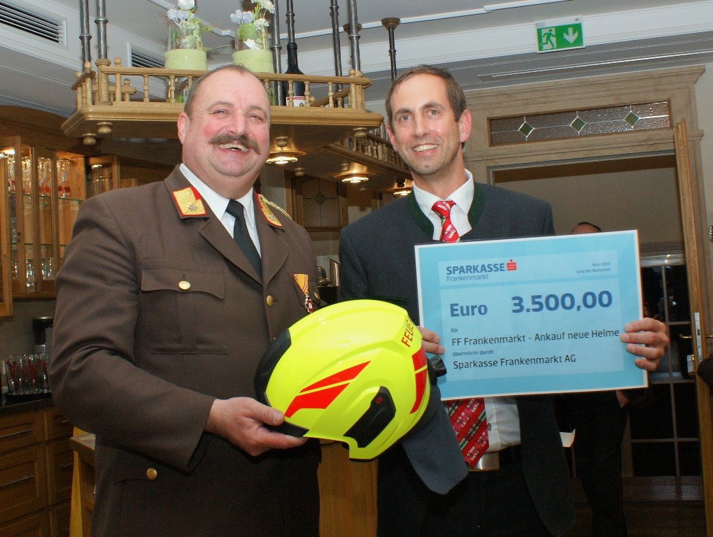 Der Kommandant der FF Frankenmarkt ABI Karl-Heinz Kirtsch konnte im Zuge der Vollversammlung eine großzügige Spende in der Höhe von EUR 3.500,- von Direktor Mag. Alexander Proksch von der Sparkasse Frankenmarkt entgegenehmen. Die Unterstützung dient zum Neuankauf von 65 Einsatzhelmen Marke HEROS-titan der Fa. Rosenbauer. Die Helme mit einem Stückpreis von ca. EUR 260,- sind bereits im Einsatz und werden von der Mannschaft sehr geschätzt.