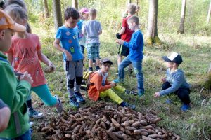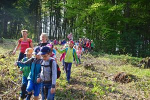So auch heute in der Gemeinde Ohlsdorf wo Manfred Spitzbart, Vorsitzender der Naturfreunde Salzkammergut mit 4 Betreuern bereits vor der Volksschule warteten, um wieder die traditionelle „Frühjahrswanderung“ zu starten. 68 Schülerinnen und Schüler der 1. Klassen Volksschule Ohlsdorf konnten es kaum mehr erwarten wegzumarschieren. Vorher gab es noch einen Fototermin vor der Schule und dann ging es in Zweierreihen im Gänsemarsch Richtung Waldgebiet in Ohlsdorf. Dort angekommen machten sich die Kids gleich daran einen Riesen Haufen mit Fichtenzapfen zu sammeln. Zwischendurch erkläre Manfred Spitzbart anhand von Schautafeln die verschiedenen Spuren die die Wildtiere im Winter im Schnee hinterlassen.