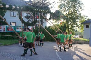 Dort warteten schon unzählige Gschwandtnerinnen und Gschwandtner, um beim traditionellen Maibaumaufstellen dabei zu sein. Die fast 28 Meter hohe Fichte wurde dann unter Anleitung mit Hilfe von Stangen aufgestellt. Da bedarf es Kraft, Hirn und Geduld und eine richtige Anleitung durch einen geübten Mitarbeiter, der schon jahrelang bei der Prozedur dabei war.