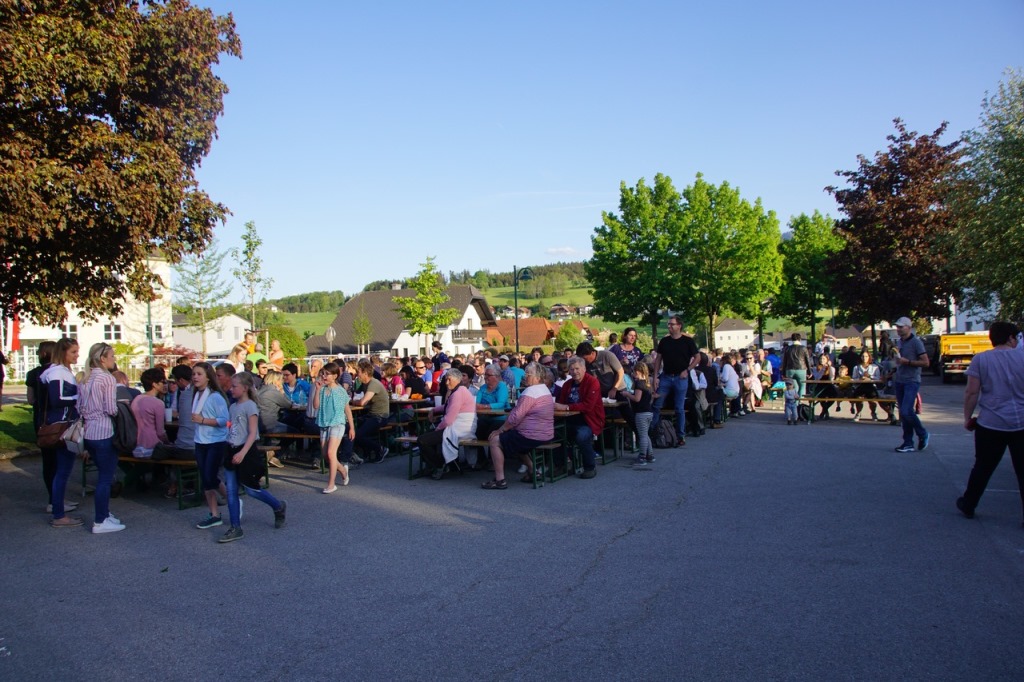 Ein ganz wichtiger Mann war auch Bürgermeister Fritz Steindl, der vom nahen Gasthaus einige Doppelliter Gerstensaft für die Maibaumaufsteller und Musiker heranschaffte. Aber auch die kleinen Gschwandtner wurden am Ende der Veranstaltung mit Zuckerl durch Bgm. Steindl belohnt. Auch dies ist schon Tradition in der Gemeinde Gschwandt.