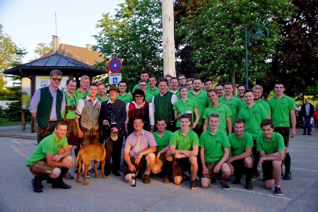 Dort warteten schon unzählige Gschwandtnerinnen und Gschwandtner, um beim traditionellen Maibaumaufstellen dabei zu sein. Die fast 28 Meter hohe Fichte wurde dann unter Anleitung mit Hilfe von Stangen aufgestellt. Da bedarf es Kraft, Hirn und Geduld und eine richtige Anleitung durch einen geübten Mitarbeiter, der schon jahrelang bei der Prozedur dabei war.