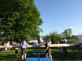 Wie in den vergangenen Jahren übt der Turnverein Gmunden 1861 den Brauch des Maibaumaufstellens aus. Schon Tage vorher wurden die Vorbereitungen dazu geleistet, Kränze gebunden und der Baum mit Reifmessern bearbeitet. Das Aufstellen des Baumes ist dann Sache der vielen Turnern, die wie Tausendfüßler den Baum in Position gebracht haben.